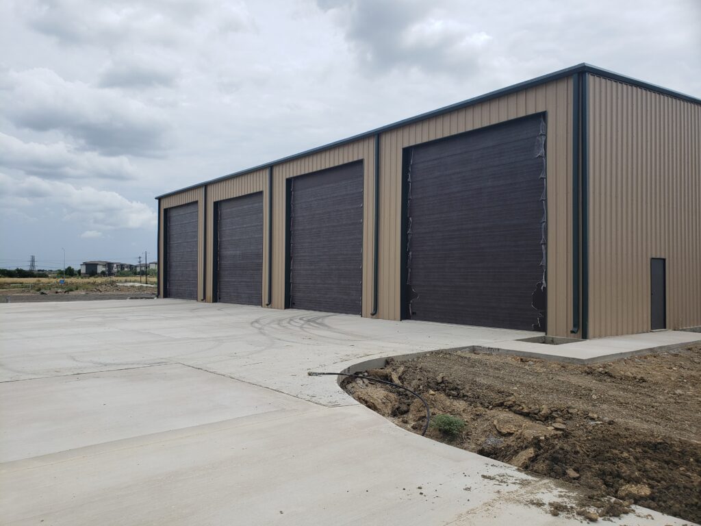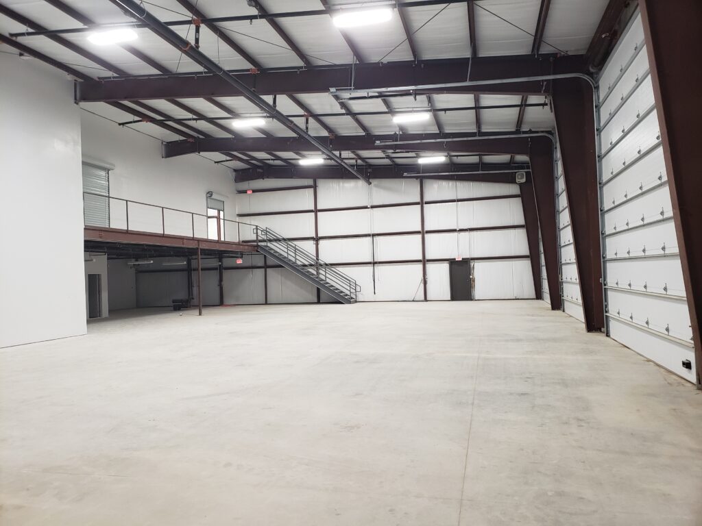 A 100'x100'x24'h steel building, with a 50% mezzanine, producing 15,000sf of space. The building is divided into four units, each with one large 18'W x 20'H overhead door on the north side and one walk door on the south.